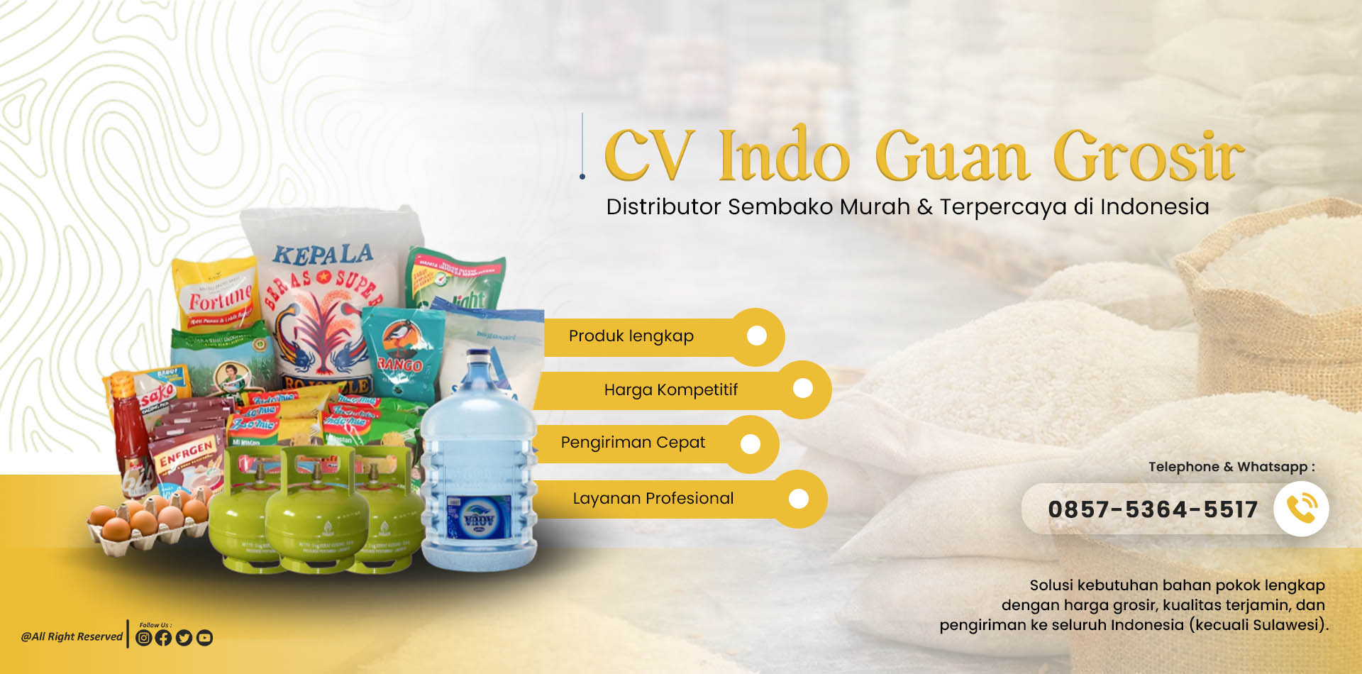 CV Indo Guan Grosir adalah distributor sembako yang berkomitmen menyediakan produk kebutuhan pokok berkualitas dengan harga grosir yang terjangkau. Kami melayani berbagai kebutuhan mulai dari skala kecil hingga besar, seperti toko kelontong, reseller, hingga kebutuhan bisnis lainnya.